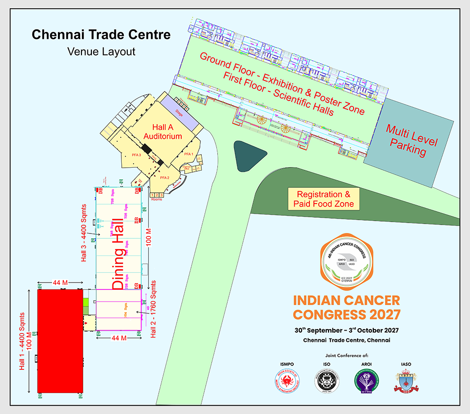 Chennai Trade Centre spread over 25.48 acres of prime land the centre has multiple halls ranging in capacity from 200-6000. More than 10000 sq. m of pillar less trade exhibition hall and parking facility for more than 2000 cars makes CTC the ideal venue for AOCR 2025.